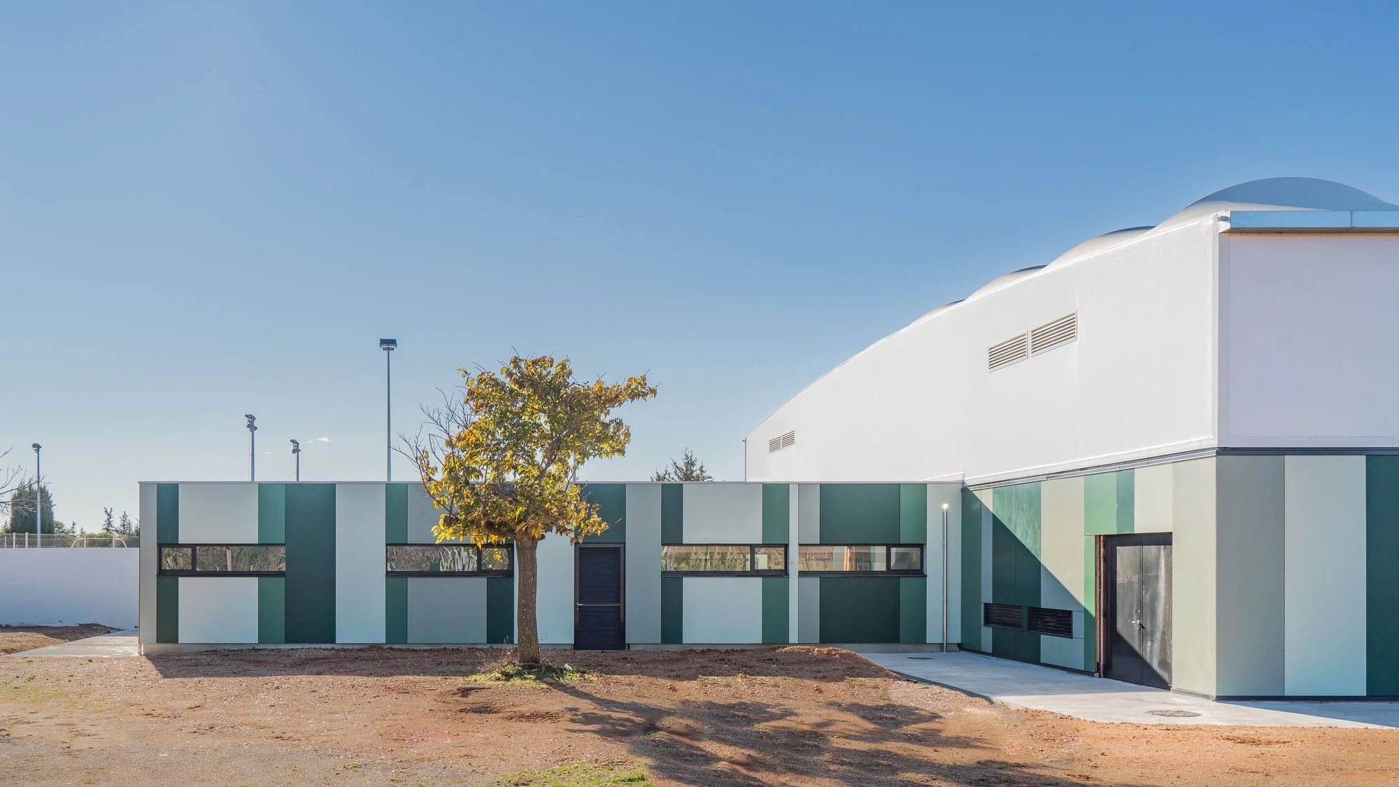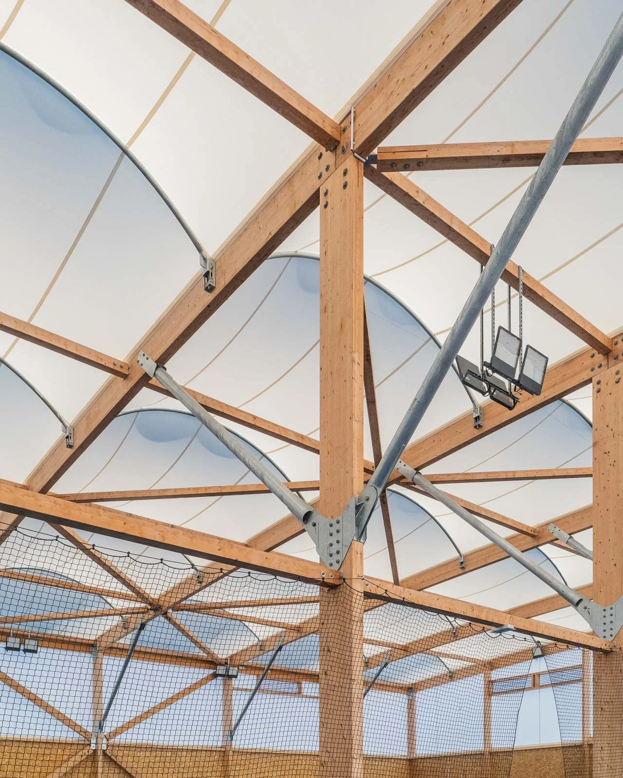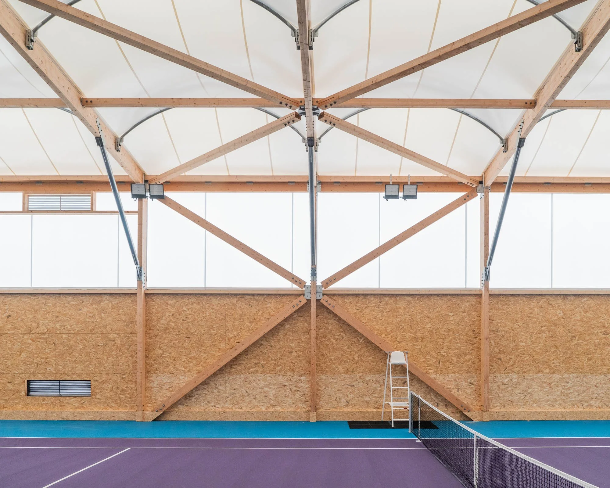 Caractéristiques Bâtiment en ossature et bardage bois et panneaux HPL, Toiture en toile, Isolation biosourcée, Acoustique soignée