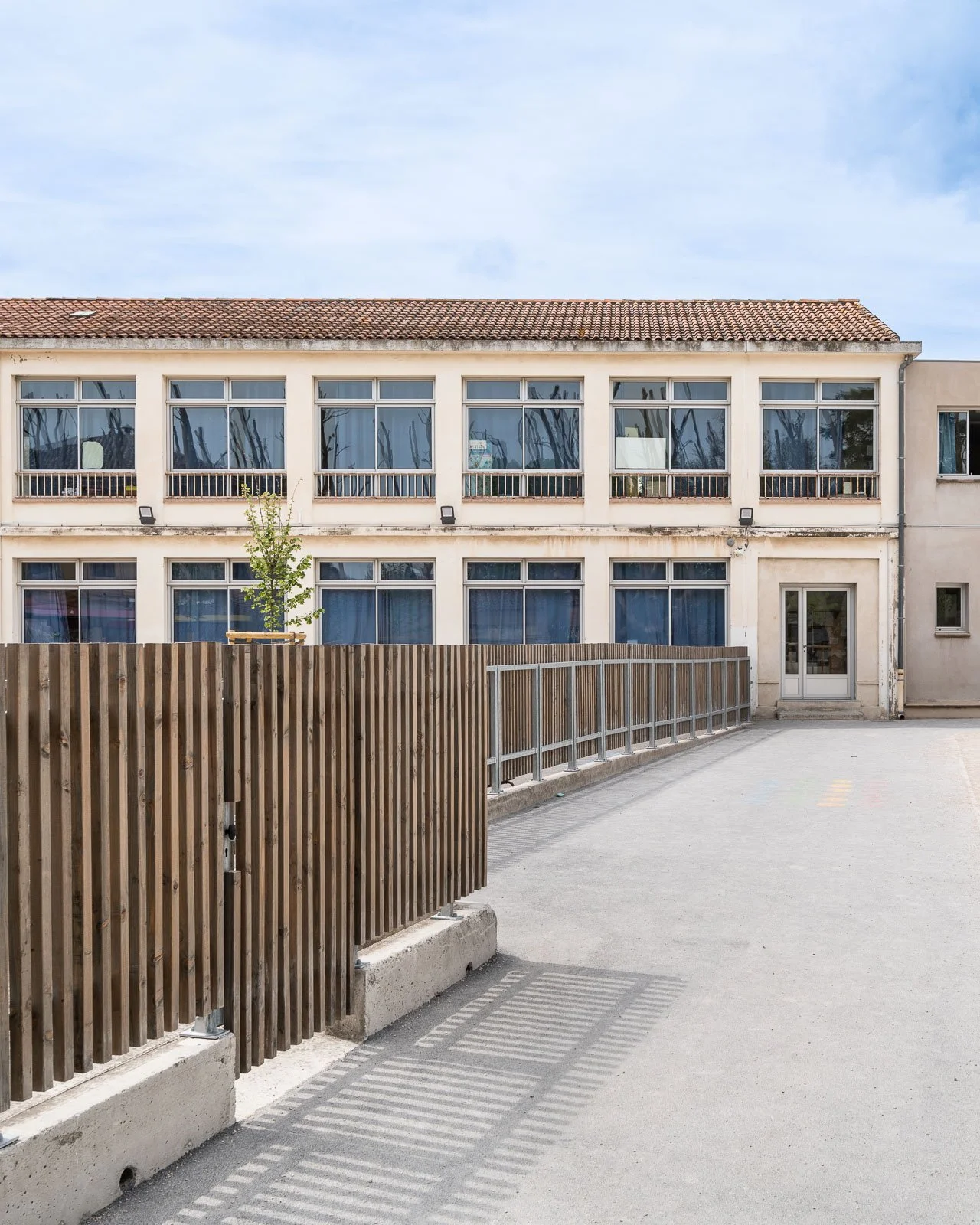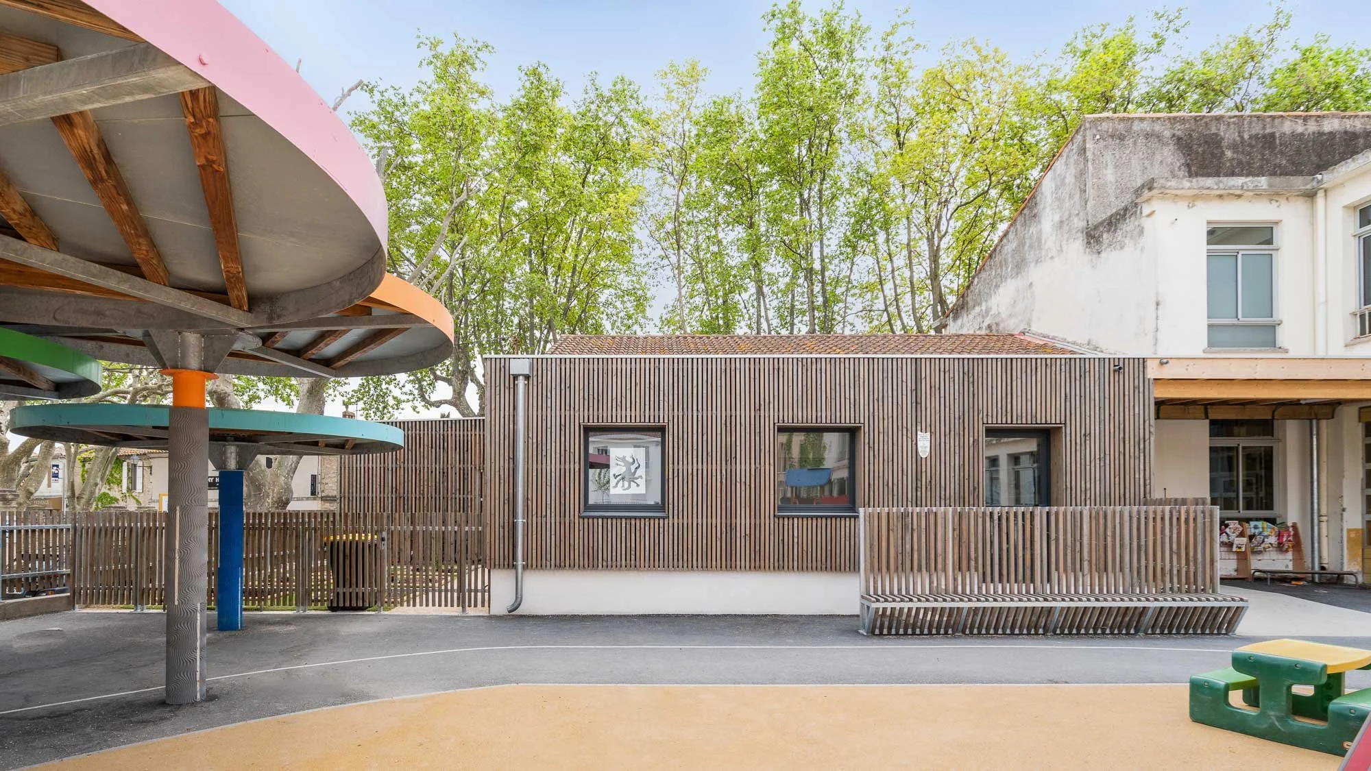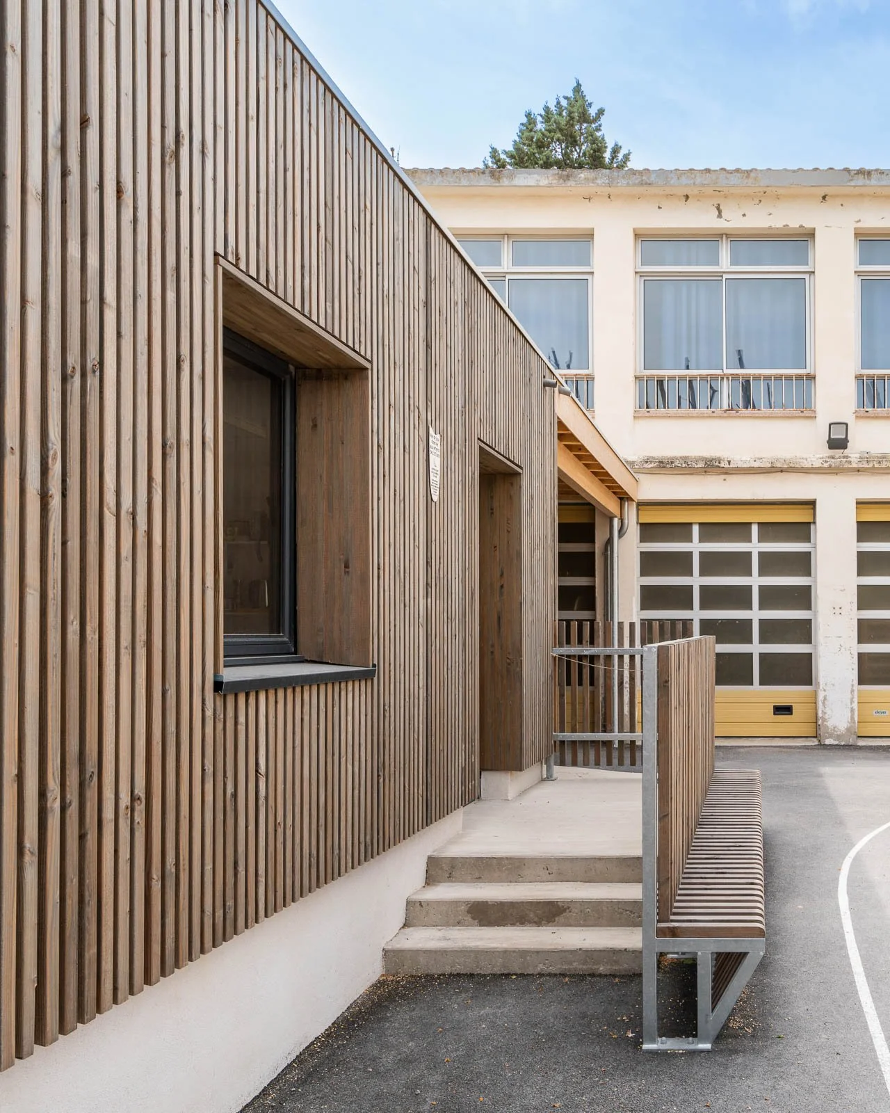 Caractéristiques Bâtiment en ossature et bardage bois, Isolation biosourcée, Désimperméabilisation de la cour d’école