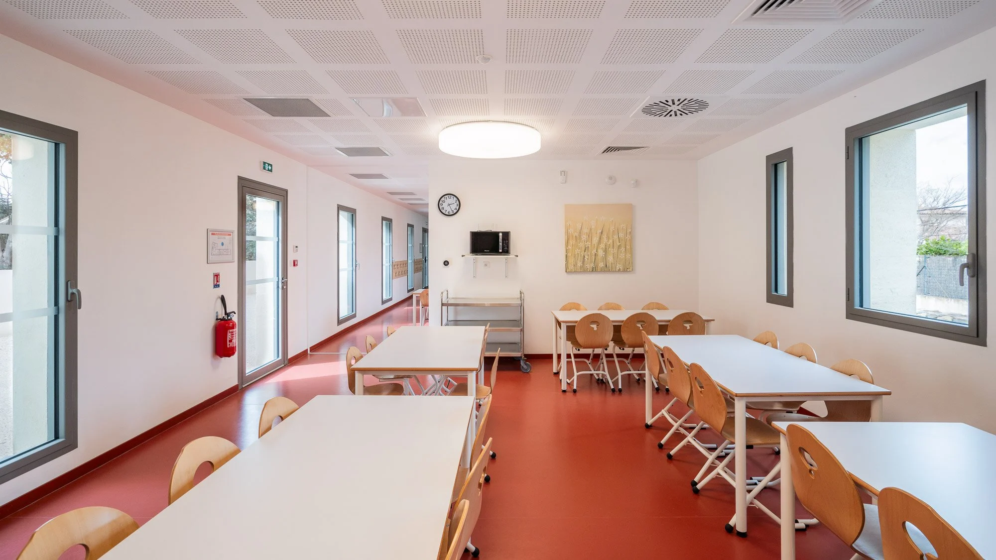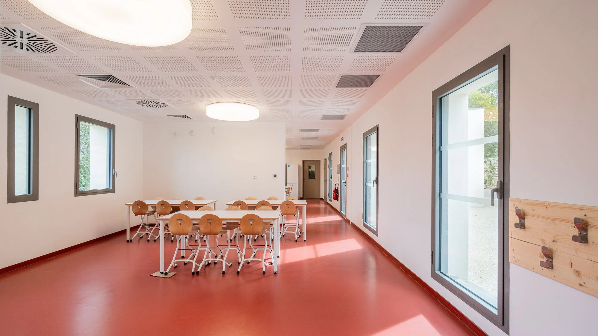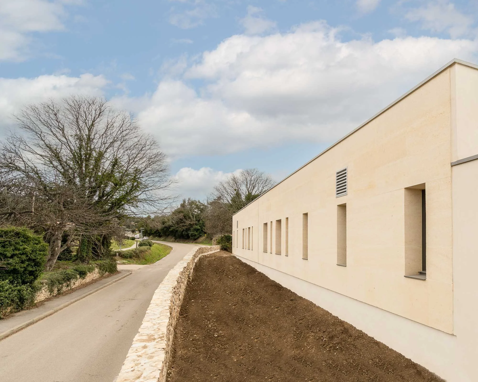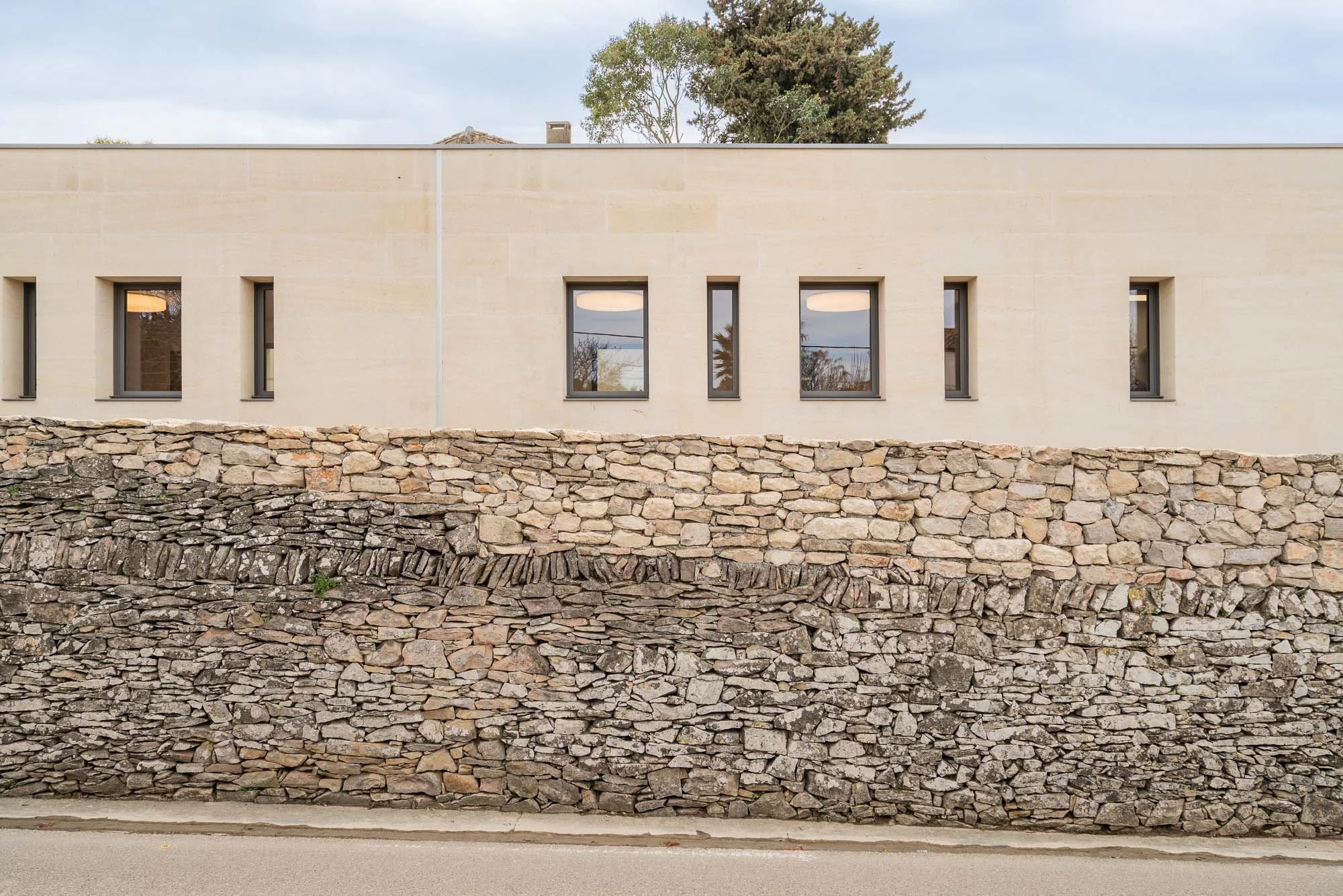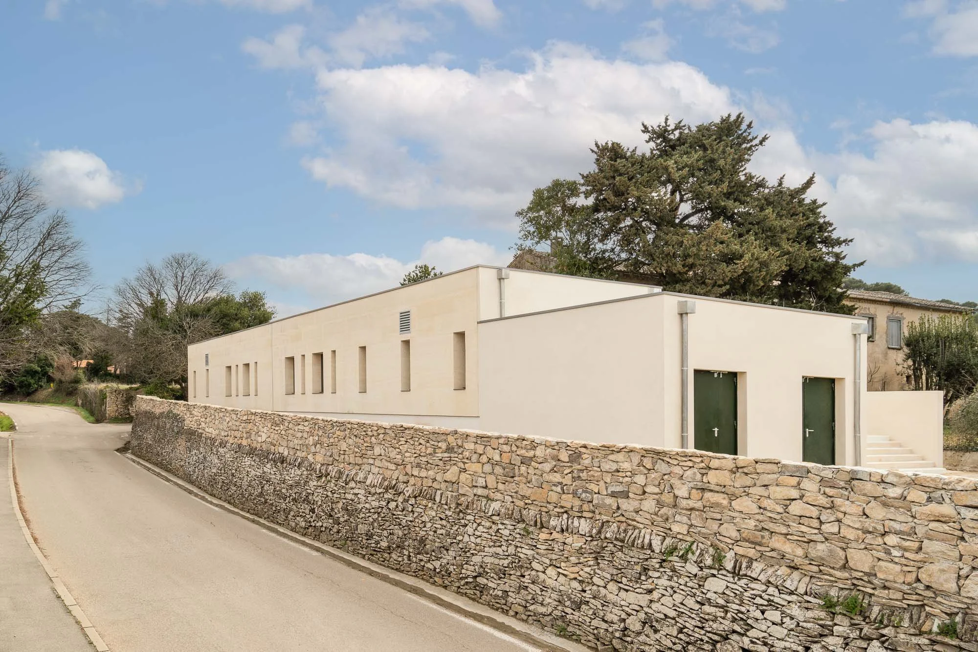 Caractéristiques Bâtiment en pierre de Beaulieu et brique monomur, Réutilisation des pierres du site pour mur en pierre sèche, Isolation biosourcée, Acoustique soignée.