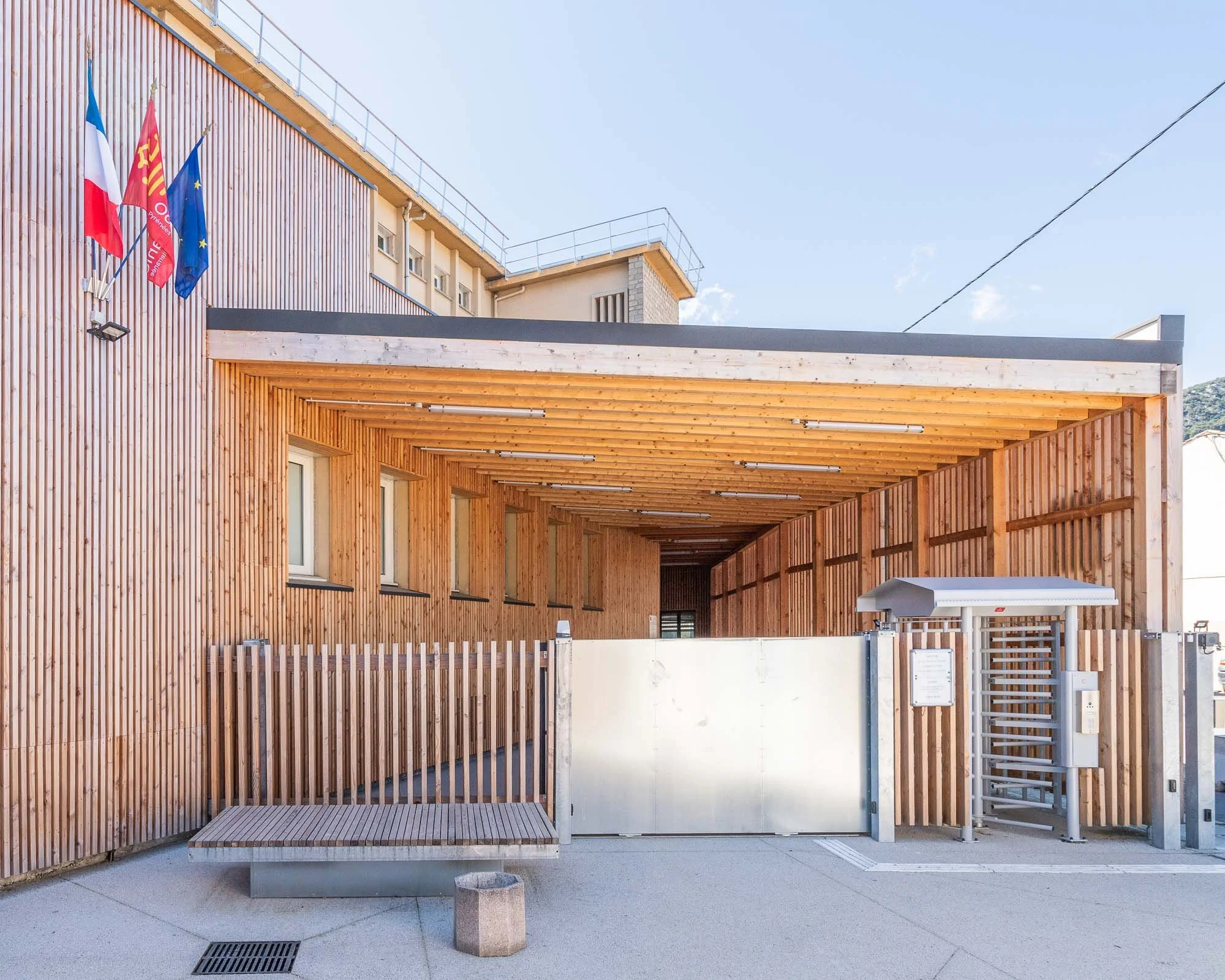 Cet ouvrage participe au réaménagement du cœur de la ville. Il apporte confort et sécurité aux élèves et aux enseignants. L'établissement présente un bardage en bois et un tourniquet de sécurisation."